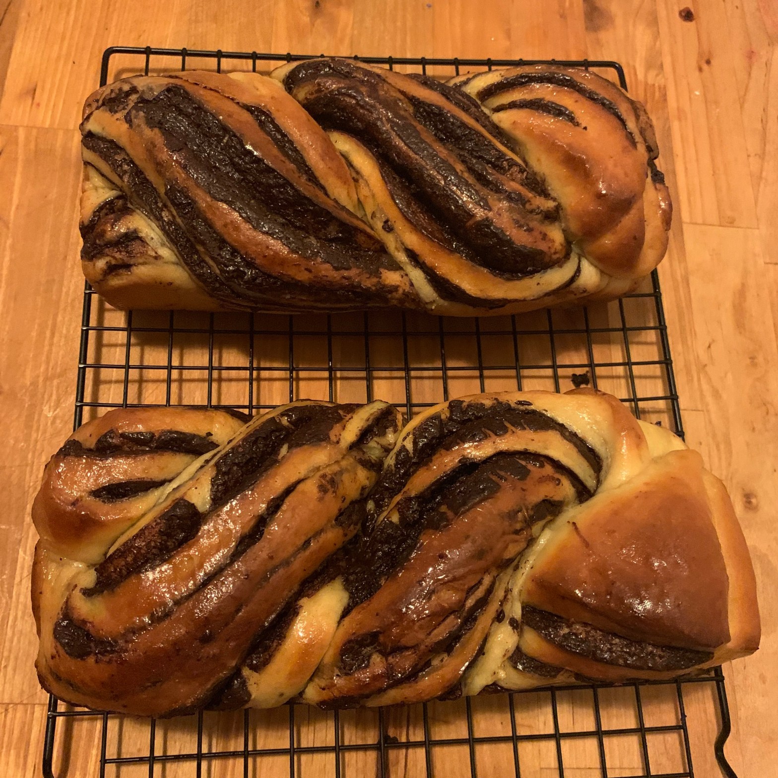 The best part of the babka-making experience was the FaceTime with my niece while rolling out the dough and painting it with the chocolate filling. This amazing girl loves cooking and baking and at 4.5 years old, is already watching Julia Child videos. With the help of her mom, she recently made chocolate cake! I know it’s hard for all the little ones right now – they don’t understand why everything has changed, why they can’t go outside, why they can’t see their friends. It seems any FaceTime I can offer my nieces is a welcome distraction for them, and opens a window of 15-30 minutes where their parents just might be able to get some work done. This time, I propped the phone up against my trusty Kitchen Aid stand mixer and chatted with her as I rolled the dough out into a rectangle, painted it with chocolate, and repeated with the other half of the dough. I just hope it was as much fun for her as it was for me!